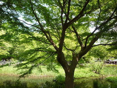 風が吹いて 湖面を揺らす、新緑の三宝寺池